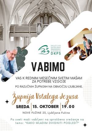 veseli smo, da ste del naše vse večje družine. Človeku res ni dobro samemu biti, zato potrebuje ob sebi ljudi, ob katerih se čuti sprejetega in varnega. Potrebuje skupnost, v kateri je lahko točno to, kar je. Skupnost, v kateri se lahko osebnostno bogati in spoznava ljudi, ki razmišljajo podobno. Trudimo se, da bi vam ponudili možnosti za osebnostno in duhovno rast, družabno življenje, nova spoznanja, pogovore … Vsakega od vas smo veseli, ko ga srečamo. Nekateri ste bolj aktivni, drugi malo manj – vsak po svoje. Vse pa je odvisno od nas samih. Čemu dajem prednost? Kaj mi je pomembno in kaj potrebujem? Z novim letom lahko naredimo spremembo in naredimo nekaj zase. Morda potrebujete redna mesečna srečanja, kjer se pri sveti maši za potrebe vzgoje skupaj kot občestvo obrnemo na našega Očeta in ga prosimo, da nam kot pedagogom stoji ob strani pri soočanju z različnimi težavami. Lahko ga prosimo ali slavimo. Lahko tudi močimo in ponižno čakamo … Vsak mesec v določen namen darujemo sveto mašo, ob tem pa s svojimi uvodi in prošnjami izpostavimo svoje skrbi, zahvale, misli … Pojdimo skupaj v Božji objem. Gotovo pa vsi tudi potrebujemo ob sebi ljudi, ki nas dvignejo, razumejo in nam dajejo občutek lastne vrednosti. Po svetih mašah se lahko srečamo, drug drugega spoznamo, podelimo izkušnje, skrbi ali veselje, morda celo rešimo svet (moj, tvoj ali naš). Odločite se! Se vidimo na svetih mašah za potrebe vzgoje vsak drugi četrtek v mesecu ob 18.30 v župnijski cerkvi sv. Jakoba na Levstikovem trgu v Ljubljani. Veselimo se skupne svete maše in srečanja z vami. Pripeljite s seboj še prijatelje. Prepričani smo, da vsi želimo mladim le najbolje: učitelji, profesorji, kateheti, svetovalni delavci, starši, stari starši, duhovniki … Molimo in izmolimo skupaj …