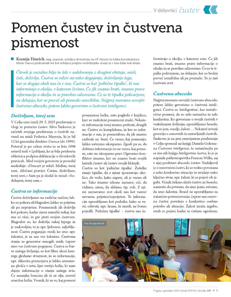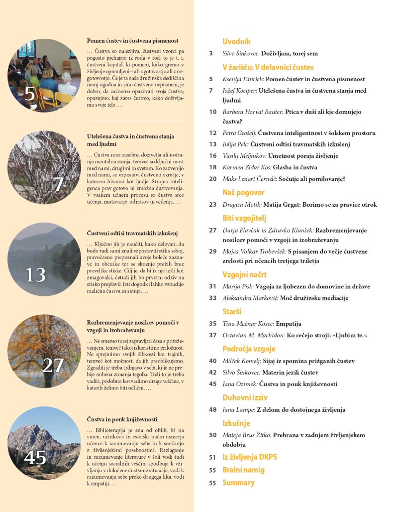 V rubriki Področja vzgoje dr. Milček Komelj predstavi sliko Spomin na Benetke slikarja Mihe Maleša. Silvo Šinkovec nam v članku zaupa svoj pogled na materin jezik čustev kot ga srečamo v Cankarjevem romanu Na klancu. Jana Ozimek z nami deli izkušnjo spoznavanja čustev pri pouku književnosti skozi različna literarna dela.
